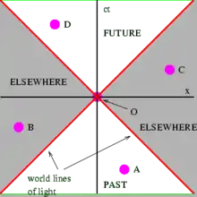 The light cone has an essential role within the concept of causality. It is possible for a not-faster-than-light-speed signal to travel from the position and time of O to the position and time of D (Fig. 2-4). It is hence possible for event O to have a causal influence on event D. The future light cone contains all the events that could be causally influenced by O. Likewise, it is possible for a not-faster-than-light-speed signal to travel from the position and time of A, to the position and time of O. The past light cone contains all the events that could have a causal influence on O. In contrast, assuming that signals cannot travel faster than the speed of light, any event, like e.g. B or C, in the spacelike region (Elsewhere), cannot either affect event O, nor can they be affected by event O employing such signalling. Under this assumption any causal relationship between event O and any events in the spacelike region of a light cone is excluded.[34]