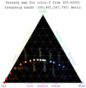 | Class | Effective temperature[3][4] | Vega-relative chromaticity[5][6][lower-alpha 1] | Chromaticity (D65)[7][8][5][lower-alpha 2] | Main-sequence mass[3][9] (solar masses) |