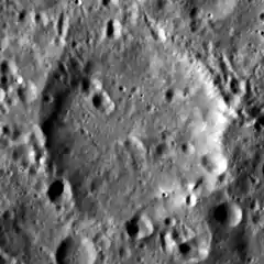 Since its formation, this crater has been heavily battered by smaller impacts, leaving the outer rim worn and marked by several small craterlets. This pattern of impact extends into the interior floor, where there are multiple small craterlets. A short chain of these impacts begins in the northwest part of the interior and curves back to extend across the northern rim.