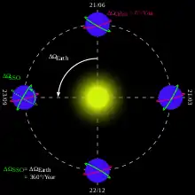 A Sun-synchronous orbit is achieved by having the osculating orbital plane precess (rotate) approximately one degree eastward each day with respect to the celestial sphere to keep pace with the Earth's movement around the Sun.[5] This precession is achieved by tuning the inclination to the altitude of the orbit (see Technical details) such that Earth's equatorial bulge, which perturbs inclined orbits, causes the orbital plane of the spacecraft to precess with the desired rate. The plane of the orbit is not fixed in space relative to the distant stars, but rotates slowly about the Earth's axis.