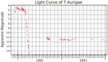 Strope and Schaefer report that the peak brightness of T Aurigae was magnitude 4.5,[8]. Pre-discovery images on photographic plates allowed the a light curve beginning in late 1891 to be constructed.[7] AAVSO data shows that T Aurigae's quiescent magnitude is 15.3.