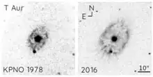 T Aurigae is surrounded by an emission nebula (shell) which is roughly elliptical (25 arc seconds by 19 arc seconds in size) and resembles a planetary nebula. Its 3-dimensional shape is similar to a prolate ellipsoid, but it has a central waist, making it shaped somewhat like a peanut.[11] Santamaria et al. obtained images of this shell from 2016 through 2019 and by comparing those images to archival images dating back to 1956, they were able to determine that the shell is expanding at about 0.01 arc seconds per year, corresponding to an expansion velocity of about 350 km/sec.[1]