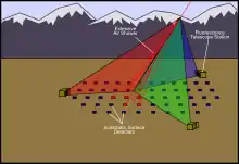 The Telescope Array observatory is a hybrid detector system consisting of both an array of 507 scintillation surface detectors (SD) which measure the distribution of charged particles at the Earth's surface, and three fluorescence stations which observe the night sky above the SD array.[2] Each fluorescence station is also accompanied by a LIDAR system for atmospheric monitoring.[3] The SD array is much like that of the AGASA group, but covers an area that is nine times larger. The hybrid setup of the Telescope Array project allows for simultaneous observation of both the longitudinal development and the lateral distribution of the air showers. When a cosmic ray passes through the earth's atmosphere and triggers an air shower, the fluorescence telescopes measure the scintillation light generated as the shower passes through the gas of the atmosphere, while the array of scintillator surface detectors samples the footprint of the shower when it reaches the Earth's surface.