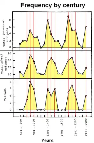 - Total penumbral lunar eclipse § Summary frequency of total penumbral, total umbral and tetrad events 501–2500 for statistics by century