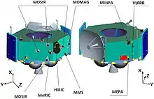 During its cruise to Mars, the spacecraft completed four trajectory correction maneuvers plus an additional maneuver to alter its heliocentric orbital inclination; it also performed self diagnostics on multiple payloads.[48][49] After payload checkouts, the spacecraft began scientific operations with the Mars Energetic Particle Analyzer, mounted on the orbiter, which transmitted initial data back to ground control.[50]