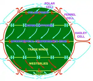 The general flow of the atmosphere is from west to east, which, however, can be interrupted by polar flows, either north-to-south flow or a south-to-north flow, which meteorology describes as a zonal flow and as a meridional flow. The terms are used to describe localized areas of the atmosphere at a synoptic scale; the three-cell model more fully explains the zonal and meridional flows of the planetary atmosphere of the Earth.