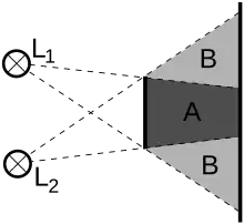 The antumbra (from Latin ante, "before") is the region from which the occluding body appears entirely within the disc of the light source. An observer in this region experiences an annular eclipse, in which a bright ring is visible around the eclipsing body. If the observer moves closer to the light source, the apparent size of the occluding body increases until it causes a full umbra.[3]