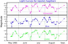 - Malcolm, G. J.; Bell, S. A. (1986). "Evidence for pulsation in the hydrogen-deficient binary Upsilon Sagittarii". Monthly Notices of the Royal Astronomical Society. 222 (3): 543. Bibcode:1986MNRAS.222..543M. doi:10.1093/mnras/222.3.543.
