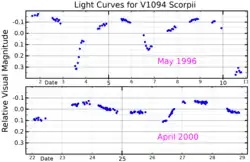 ![]() Visual band light curves for V1094 Scorpii, adapted from Wichmann et al. (1998)[1] and Joergens et al. (2001)[2] | |