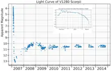 The early period after V1280 Scorpii's eruption was observed in great detail by the Solar Mass Ejection Imager (SMEI) instrument on the Coriolis satellite. This satellite obtained a brightness value for the nova every 102 minutes. The rise to peak brightness was exceptionally slow.[8] The SMEI light curve shows three well defined maxima for the nova, occurring around 03:00 UT on 16 February, 08:30 UT on 17 February and 05:00 UT on 19 February 2007.[4] The nova declined slowly from peak brightness until the end of February 2007, at which time it began fading rapidly as dust formed in the ejected material. At the same time dust formation was causing the visual light curve to plummet, the infrared brightness increased.[9] The formation of V1280 Scorpii's dusty structure was observed in the near (K-band) and mid (N band) infrared by the VLT interferometer, and the interferometer was able to measure the expansion of the dust shell. These were the first such observations for any nova.[8] On day 100, another brightening was observed, which corresponded to a second mass loss event. The expanding dust shell around the nova has an estimated velocity of 350 km/s.[10] The mass of the nova's white dwarf has been estimated to be 0.6 M☉, based on the SMEI light curve.[4]