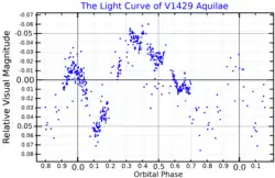 V1429 Aquilae shows brightness variations of about 0.3 magnitudes and a detectable period of 4.16 days. No longterm variations in brightness have been detected over several decades of observations.[13] The profiles of many spectral lines also vary with the same period, produced partly by radial velocity variations.[14] The absorption and emission lines show different radial velocity amplitudes, but with the same period. Most of these variations can be accounted for by the orbit of the two stars and material being transferred from the primary to the secondary, with the gas being involved in partial eclipses,[6] and possibly also partial eclipses of the stars themselves.[8] The two stars are also distorted into ellipsoidal shapes by their gravity and vary in brightness as they rotate.[6]