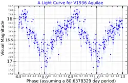 V1936 Aquilae is a blue supergiant and candidate Luminous blue variable located in the nebula Westerhout 51, in the constellation Aquila, about 20,000 light years away. The star was originally identified as a massive star in 2000,[3] and was thought to be an O-type supergiant. However, subsequent analyses have shown it to be not O but B-type,[5] as well as being possibly an LBV.[4]