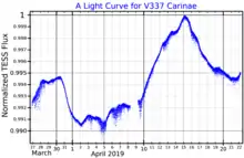 V337 Carinae has two companions listed in multiple star catalogues. Both are 13th-magnitude stars, component B 16.9″ and component C 25.9″ away.[12] Component B is a distant background star,[13] while component C is at about the same distance as V337 Carinae.[14]