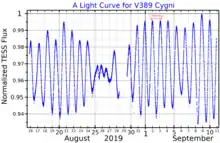 V389 Cygni, also known as HD 201433 and HR 8094, is a star about 390 light years from the Earth, in the constellation Cygnus. It is a 5th-magnitude star, making it faintly visible to the naked eye of an observer far from city lights. V389 Cygni is a multiple star.[4] One component of that system is a slowly pulsating B-type star (SPB) causing the system's brightness to vary from magnitude 5.55 to 5.71 over a period of 1.4 days.[6]