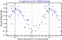 V399 Carinae has long been suspected to be variable.[16] A 1981 study of yellow supergiants fit observations to a Cepheid-like light curve with a period of 58.8 days, although the luminosity and spectral type do not place the star near the Cepheid instability strip.[13] It was listed in the General Catalogue of Variable Stars as a possible δ Cep variable.[17] Further observations refined the period to 47.25 days.[7] The Hipparcos catalogue classified V399 Car as a semiregular variable with a period of 88 days and a mean amplitude of only 0.04 magnitudes.[18] An automated classification from Hipparos photometry suggested it is an α Cygni variable.[19] The observed brightness varies from magnitude +4.63 to +4.72.[2]
