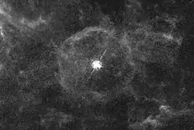 ![]() V4998 Sagittarii and its surrounding shell nebula. The nebula appears as a transparent bubble-like body encircling the star. Credit: HST\NIMCOS | |