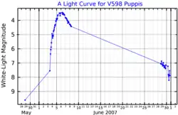The nova has been officially named V598 Puppis and is "one of the brightest for almost a decade".[6] Despite its brightness, the nova was apparently missed by amateur and professional astronomers alike until XMM-Newton spotted the unusual X-ray source while turning from one target to another. The All Sky Automated Survey determined that that nova had occurred on June 5, 2007.