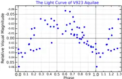 ![]() A photoelectric (yellow) light curve for V923 Aquilae, plotted from data presented by Lynds (1960).[1] The length of a full phase cycle is 0.8518 days. | |