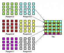 Over an area corresponding to 1.65° diameter on the sky, the image plane has 16 arrays of infrared detectors,[16] each array with 2048x2048 pixels of 20 μm size, corresponding on average to 0.34" on the sky.[18] The focal length of 12.1 m combines with the baffled aperture of 3.7 m to a focal ratio of 3.26. The arrays are separated by 90% of their width in one direction and by just under 50% their width in the other direction. A single exposure therefore corresponds to a patchy "paw print" on the sky. To fill the gaps and obtain a conventional image at least six shifted paw prints have to be combined into a "tile", which then is 1.5° by 1.0°. The image plane of the camera also has wave front detectors used to control the shape of the primary mirror and the position and tip/tilt of the secondary mirror (active optics). This compensates for flexure and ensures a focused image at all altitudes.[18]