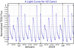 VZ Cancri is a variable star in the constellation Cancer, abbreviated VZ Cnc. It varies in brightness with a period of 0.178364 days, from an apparent visual magnitude of 7.18 down to 7.91,[3] which lies below the typical threshold of visibility for the naked eye. The distance to this star is approximately 724 light years based on parallax measurements,[2] and it is receding from the Sun with a radial velocity of 25 km/s.[6]