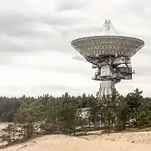 Located in woodlands near Irbene, in Ventspils Municipality, Latvia, the centre was founded in 1974 by the Soviet military.[2] It originally consisted of a 32-metre telescope, along with two smaller telescopes and a communications centre, and was known as Zvezdochka, meaning "Little Star". It was possibly used by the KGB during the Cold War to spy on communications between Europe and the United States.[3]