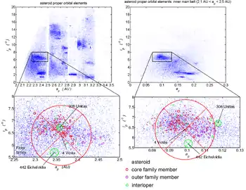 The Vesta family (adj. Vestian; FIN: 401) is a family of asteroids. The cratering family is located in the inner asteroid belt in the vicinity of its namesake and principal body, 4 Vesta. It is one of the largest asteroid families with more than 15,000 known members and consists of mostly bright V-type asteroids, so-called "vestoids".