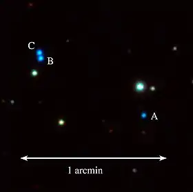 | Apparent magnitude (V) | 17.27 (A) · 16.05 (B) · 16.29 (C) |