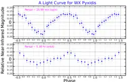 ![]() Near-infrared (J band) light curves for WX Pyxidis, showing variation over the white dwarf rotation period (top) and orbital period (bottom). Adapted from Joshi et al. (2011)[1] | |