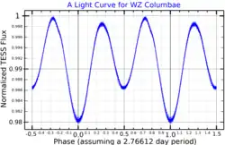 WZ Columbae was originally listed as a slowly pulsating B-type star by the General Catalogue of Variable Stars. However, observations from Hempel & Howlger (2003) reveal it to be overabundant in strontium and barium.[14] Combined with Hipparcos photometry, this led to the object being reclassified as an Alpha2 Canum Venaticorum variable.[8] Based on data collected in the Hipparcos passband, it fluctuates between magnitudes 5.27 and 5.29 over 1.38 days.[7][20] However, TESS data suggests a period of 2.76618±0.00004 days; double that of the earlier data.[16]