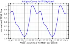 The supergiant component W Sgr Aa1 is a variable star which pulsates regularly between magnitudes 4.3 and 5.1 every 7.59 days. During the pulsations, that temperature and spectral type also vary. It is classified as a Classical Cepheid (δ Cephei) variable.[5]