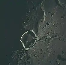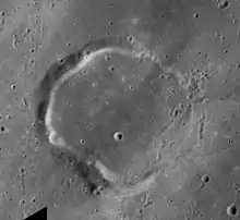 Wallace is the remains of a lunar impact crater that has been flooded by lava. It was named after British natural historian Alfred Russel Wallace.[1] It lies in the southeastern part of Mare Imbrium, to the northeast of the crater Eratosthenes. The crater rim forms a somewhat polygonal outline, and is broken in the southeast. The floor is flat and devoid of significant features, but it is overlain by ray material from Copernicus to the southwest. The rim ascends to an altitude of 0.4 km above the lunar mare.