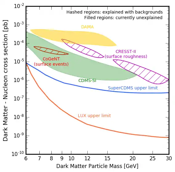 There are currently no confirmed detections of dark matter from direct detection experiments, with the strongest exclusion limits coming from the LUX and SuperCDMS experiments, as shown in figure 2. With 370 kilograms of xenon LUX is more sensitive than XENON or CDMS.[28] First results from October 2013 report that no signals were seen, appearing to refute results obtained from less sensitive instruments.[29] and this was confirmed after the final data run ended in May 2016.[30]