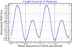 An Alpha2 Canum Venaticorum variable, Xi Phoenicis's visual magnitude varies between 5.68 and 5.78 with a period of 3.9516 days,[6] which is the rotation period of the star and is also associated with changes in the spectrum and the magnetic field. The brightness variation is maximum in the v band, with an amplitude of 0.13 magnitudes. The light curve in this band is symmetrical and has two distinct minima separated by half a rotation period, while the two maxima are igual. In other bands the variability is smaller or even absent, and doesn't show a regular pattern like in v.[10] The star is similar in many aspects to rapidly oscillating Ap stars, but does not display the rapid pulsations typical of these stars.[14]