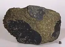 ![]() Yamato 000593 meteorite – 13.7 kg (30 lb) - cube is 1 cm (0.39 in) (NASA; 2012). | |