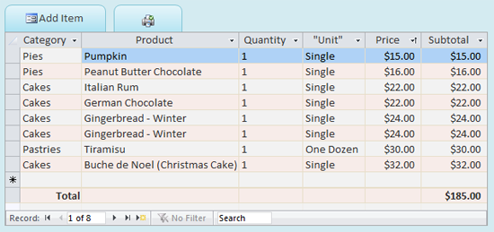 In our database, order items are stored in a separate table from the orders themselves. In order to enter and display order data, this form includes an embedded sub-form and table. This orders table can be viewed and searched like a normal table, but it only includes data linked to this particular order.