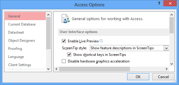 Here you can change various Access options. For example, you can choose a form to automatically display when your database is opened or modify the default cell and font style.