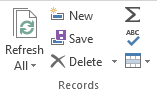 The Records command group on the Home tab contains a handful of commands for working with records, including New Record, Save Record, and Delete Record.