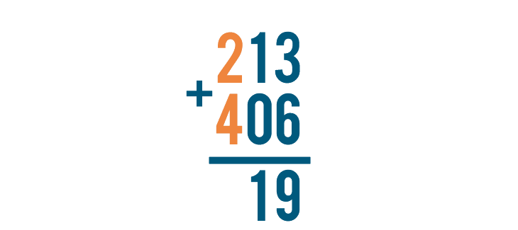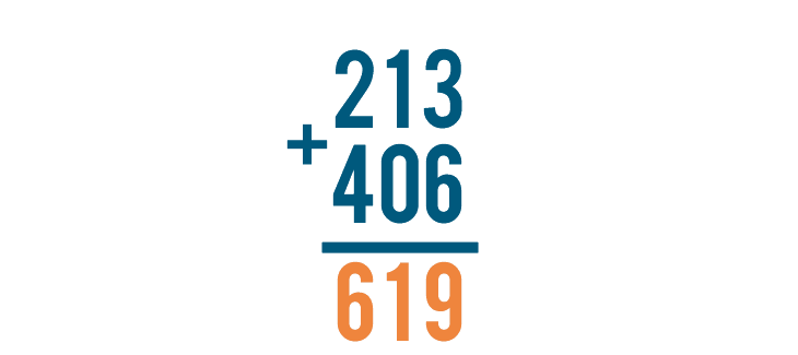 The problem is complete. Our total is 619, or six hundred and nineteen. 213 + 406 = 619.