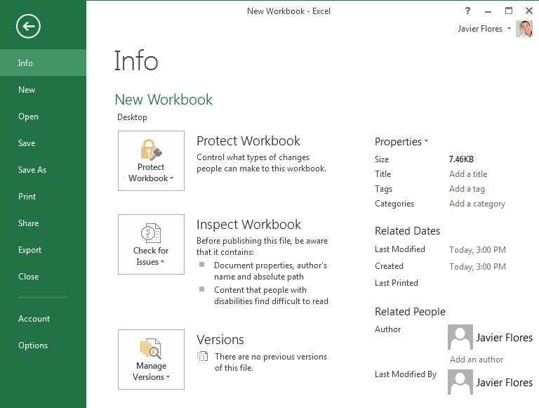 The Info pane will appear whenever you access Backstage view.