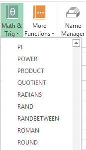 The Math & Trig category includes functions for numerical arguments. For example, you can round values (ROUND), find the value of Pi (PI) multiply (PRODUCT), subtotal (SUBTOTAL), and much more.