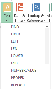 The Text category contains functions that work with the text in arguments to perform tasks, such as converting text to lowercase (LOWER) or replacing text (REPLACE).