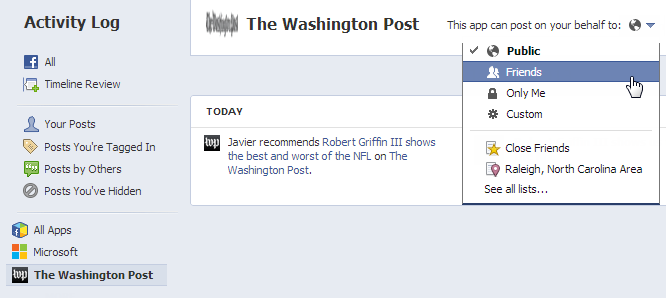 Here, you can review what your apps have posted to your Timeline, such as recent recommendations or game activity. You can even set the audience level for each app to control who can see future app activity on your Timeline.
