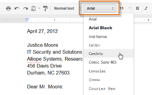 When you create a document in Google Docs (Drive), the interface for Documents will appear. This interface displays the toolbar, along with the main view of your document. It allows you to type and modify text, in addition to sharing a document with others.