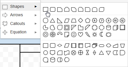 Google Documents provides a wide variety of shapes, arrows, callouts, and equation shapes. They can be resized, reordered, and customized with text.