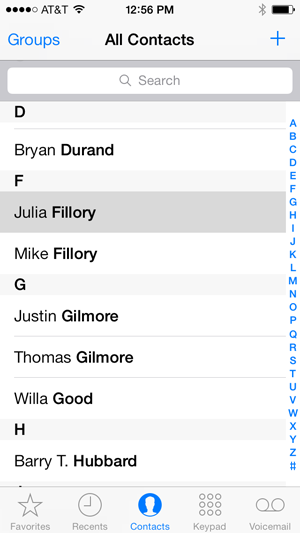 Tap Favorites to view contacts saved as Favorites. Tap the + button to add a contact to your Favorites list.