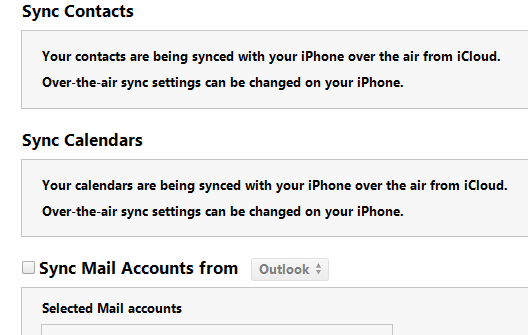 From here, you can choose to sync contacts, calendars, and email accounts from your computer to your iPhone.