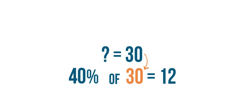• We can replace the question mark in our original example with 30. Now we know that 12 is 40% of 30.