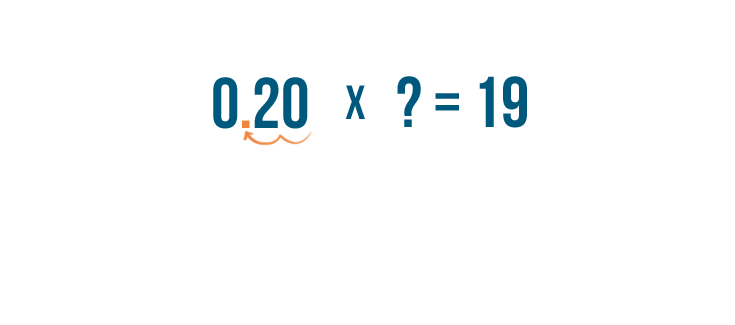 • We'll replace 0.20 with 1 and divide the other side of the equation. 19 divided by 0.20 equals 95.
