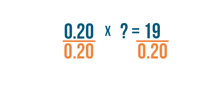 • We'll divide 0.20 by itself to get rid of it. To keep the two sides equal, we'll have to divide the 19 by 0.20 too.