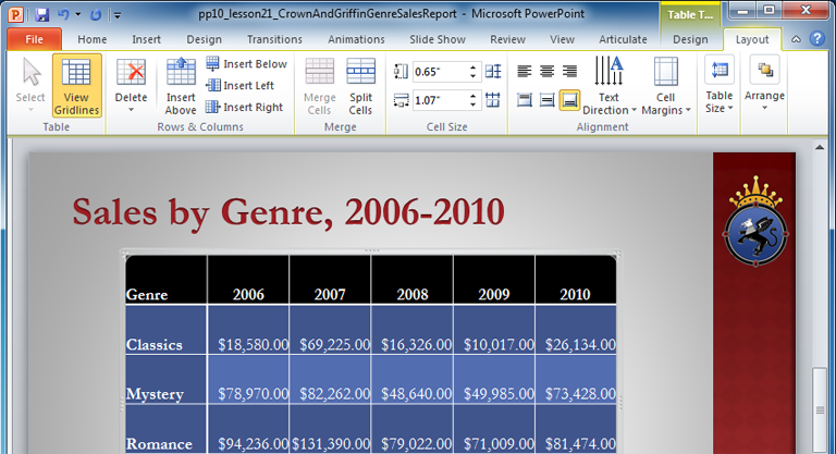 When you select a table in PowerPoint 2010, Design and Layout tabs appear under Table Tools on the Ribbon. Using commands on the Layout tab, you can make a variety of modifications to the table.